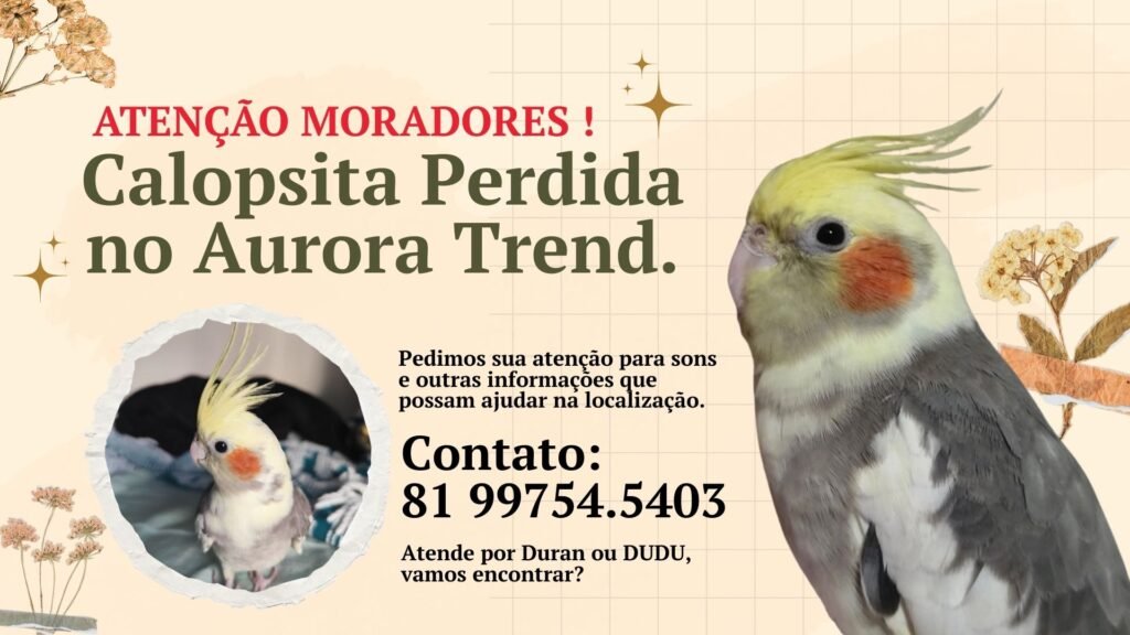 No momento, encontra-se cadastrada uma calopsita desaparecida, pertencente a uma moradora do condomínio, que pode estar nas dependências do prédio ou em algum apartamento. O contato divulgado pelos proprietários é o telefone: 81 9754-5403